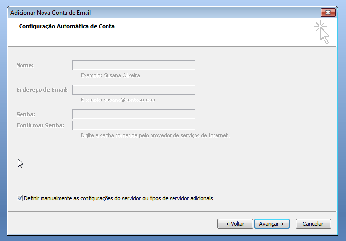 Na tela Adicionar Nova Conta de Email você deve preencher com os seguintes dados: