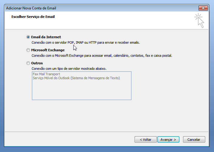 Na próxima tela clique em Email da Internet