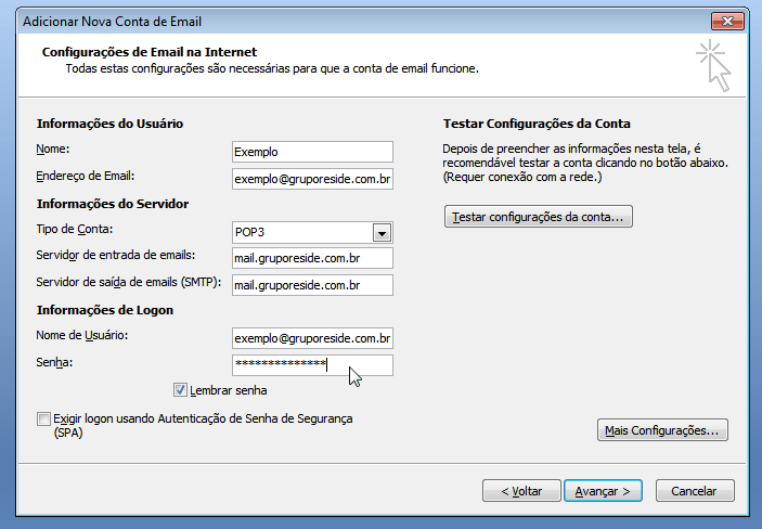 Nome: O nome que será exibido quando alguém receber um email seu. Ex.: Maria da Silva Endereço de Email: O email em questão. Tipo de conta: POP3 Servidor de Entrada: mail.seudominio. Ex.: mail@gruporeside.com.br Servidor de Saída: mail.seudominio. Ex.: mail@gruporeside.com.br Nome de Usuário: Seu email novamente. Senha: A senha do seu email